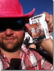 Bright and early Friday morning, Aaron and I got dressed up in our cowboy gear and headed on over to the Rodeo School. First up was Calf Roping On Foot, and Chuck did a great job getting us started. The lasso action felt pretty natural after a bit of practice, and I very nearly roped a couple calves during practice. Unfortunately, “very nearly” was as close as I got all weekend, and I quickly learned why the vets call this event “Throw Your Rope In The Dirt”.
